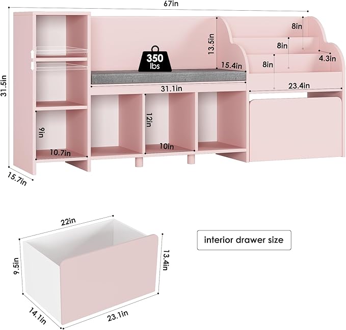 • [4-in-1 Bookshelf] This versatile masterpiece seamlessly integrates storage cubbies, a book rack, a mobile toy box, and a comfortable cushioned seat, forming an organized and joyful play area for your child while offering convenient access to books and toys to keep the space tidy