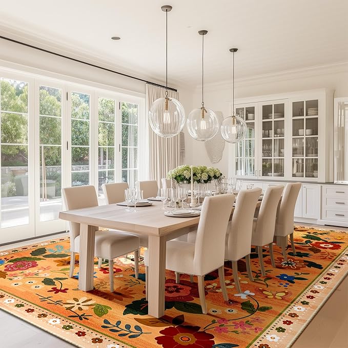 • Soft & Non Slip: Our living room rugs are made of reinforced polyester, providing softness and wear resistance,making it an ideal choice for high-traffic areas and homes with pets. The area rug features a non-slip TPR backing,you don’t need to pay for an extra rug pad.It can prevent slips and falls while keeping the bottom dry.This living room rug offers both comfort and safety for your family