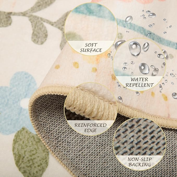 • Machine Washable:The bedroom rugs are machine washable,allowing for both machine wash and hand wash options.It is recommended to wash them in cold water.This floral rug is crafted with a low pile that won’t block opening and closing doors, make machine wash possible.Small stains can be blotted with a rag,soft-bristled brush,vacuum,or robotic vacuum cleaner.Avoid using bleach and high-temperature ironing
