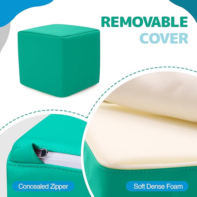 • Easy Maintenance: The surface material of blocks is PU leather. Each foam block features a removable, washable fabric cover, ensuring cleanliness after hours of play. Designed for durability, they quickly regain their shape after being compressed during shipping, ready to create a vibrant toddler zone filled with colorful softscape adventures