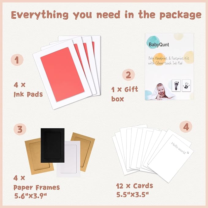 • 【Product Details】: Our baby hand and footprint kit measures 6.0"x4.2" with an ink window of 4.9"x3.1", which is the best size for recording hand and footprints of newborns 0-6 months old or pet paw prints . The ink pad for baby hand and footprints includes 4 clean touch ink pads, 12 stamping cards, and 3 display frames, ensuring you have ample opportunity to capture the best stamp.