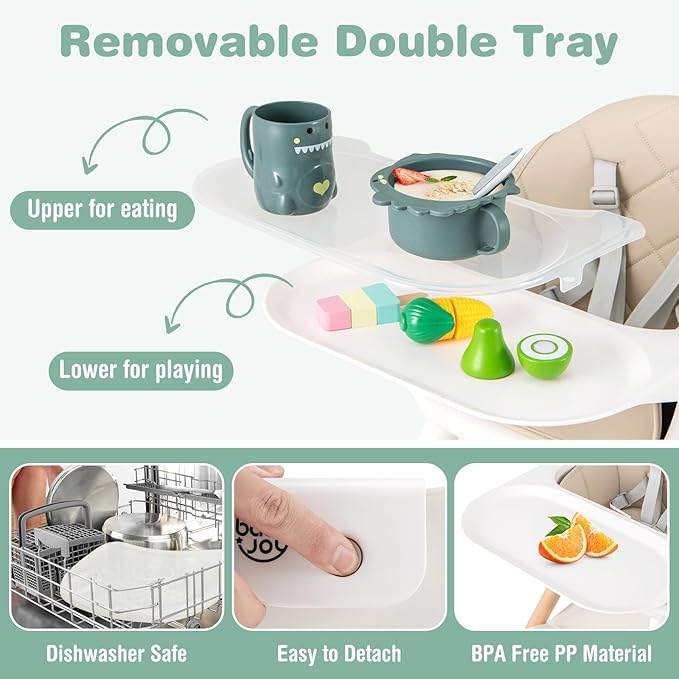 • Removable Double Tray: This infant feeding chair is equipped with a double tray that can be easy to detach according to your needs. The upper tray is suitable for eating and feeding, and the lower tray is ideal for playing. The tray is made of BPA free PP material and harmless to the health of your baby.