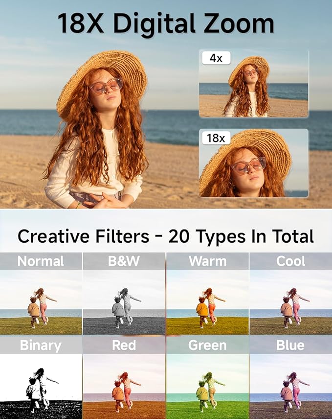 • 18x Digital Zoom & 20 Creative Filters: The digital camera for travel offers an enhanced 18x digital zoom, allowing you to capture distant subjects clearly and in great detail. With 20 diverse filters, including vintage, Y2K, and old school styles. This digital camera is truly the first camera for begginers, ideal for those who like retro styles and y2k aesthetics.