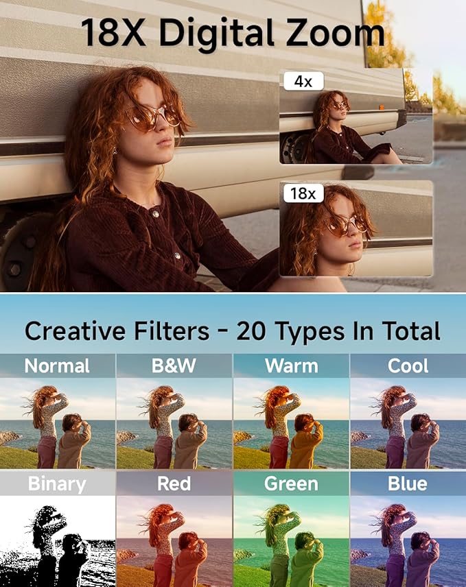 • 【18x Digital Zoom & 20 Creative Filters】The digital camera for travel offers an enhanced 18x digital zoom, allowing you to capture distant subjects clearly and in great detail. With 20 diverse filters, including vintage, Y2K, and old school styles. This digital camera is truly the first camera for begginers, ideal for those who like retro styles and y2k aesthetics.