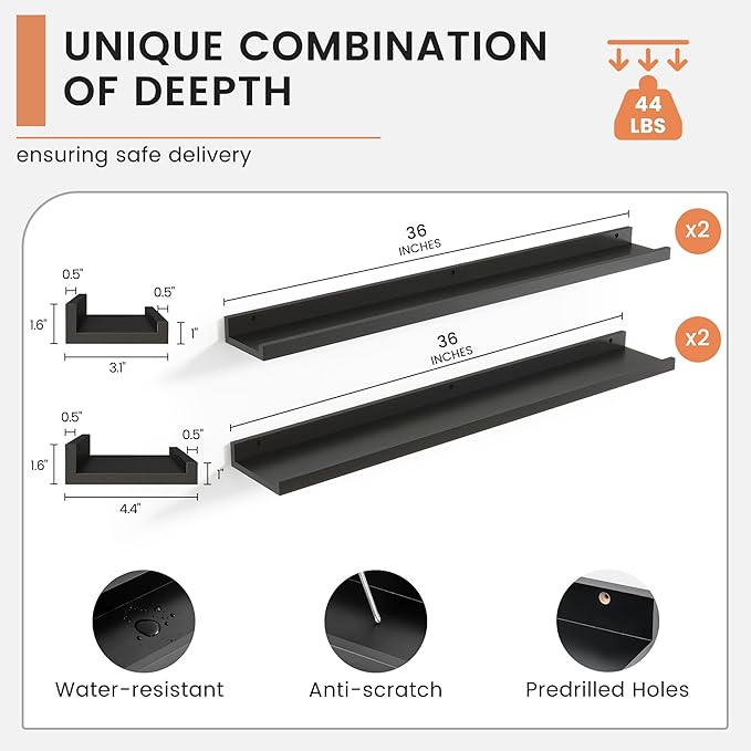 • 【Picture Ledge Perfect for Display】FLYJOE picture ledge shelves for wall turn your walls into a stunning photo gallery! These spacious shelves are ideal for showcasing a variety of picture frames in one secure place. With a thoughtful protective lip, you can display everything from photos to collectibles without worrying about them falling off