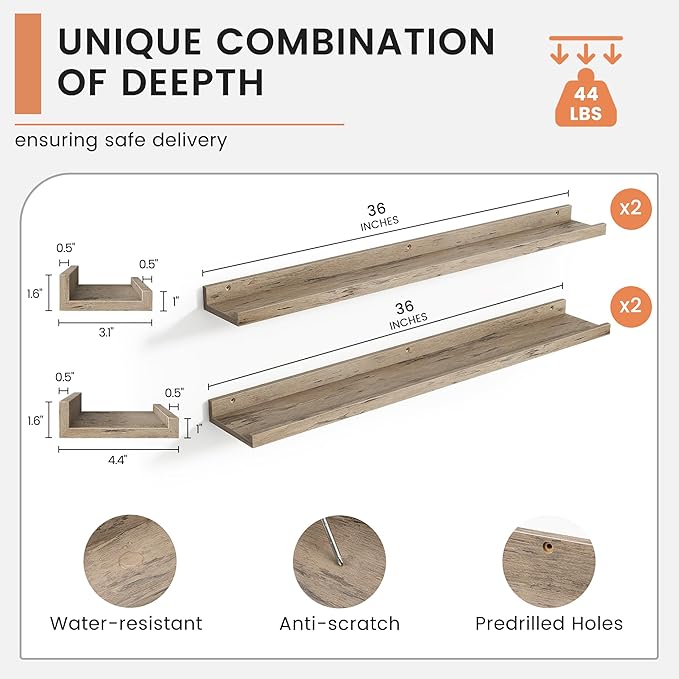 • 【Picture Ledge Perfect for Display】FLYJOE picture ledge shelves for wall turn your walls into a stunning photo gallery! These spacious shelves are ideal for showcasing a variety of picture frames in one secure place. With a thoughtful protective lip, you can display everything from photos to collectibles without worrying about them falling off
