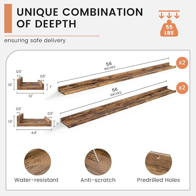 • 【Picture Ledge Perfect for Display】FLYJOE picture ledge shelves for wall turn your walls into a stunning photo gallery! These spacious shelves are ideal for showcasing a variety of picture frames in one secure place. With a thoughtful protective lip, you can display everything from photos to collectibles without worrying about them falling off