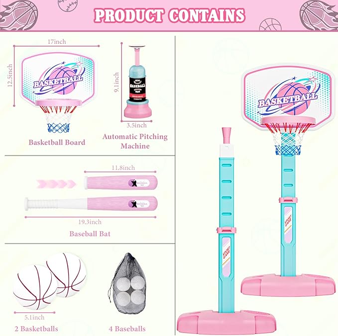 • 【MULTIPLE WAYS TO PLAY】①Basketball Hoop: Equipped with 2 high-elastic basketballs to make playing basketball more fun. ②Baseball Tee Stand: Ideal for helping little girls practice batting skills and improve hand-eye coordination. ③Automatic Launcher: Baseball bounces automatically and hits the baseball quickly, making the game challenging and fun