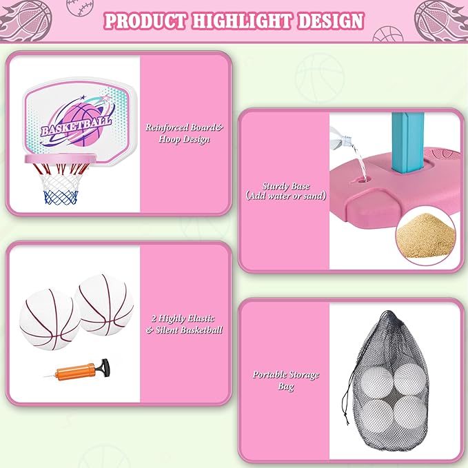 • 【GROW WITH YOUR GIRLS】This pink versatile basketball hoop & tee ball set is designed for girls, aiming to cultivate their love of sports from a young age. It adopts a simple snap-on design, which can be freely adjusted according to the height change of baby girls, let the basketball baseball toy grow with your child. Baseball stand height range: 31.5 - 42 inches, Basketball stand height range: 24.3 - 35.3 inches