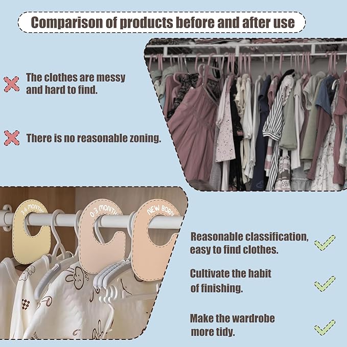 • 【Easily Divide Baby Clothes】 With clear, easy-to-read labels for different sizes and types of clothing, these 8 pack of baby closet dividers make it simple to organize and locate your baby's outfits at a glance. The baby clothes hanger dividers enhanced clarity. Each baby dividers for closet includes dividers for baby age ranges and clothing sizes, from newborn to toddler, ensuring that as your baby grows, their closet still remains neat and orderly.