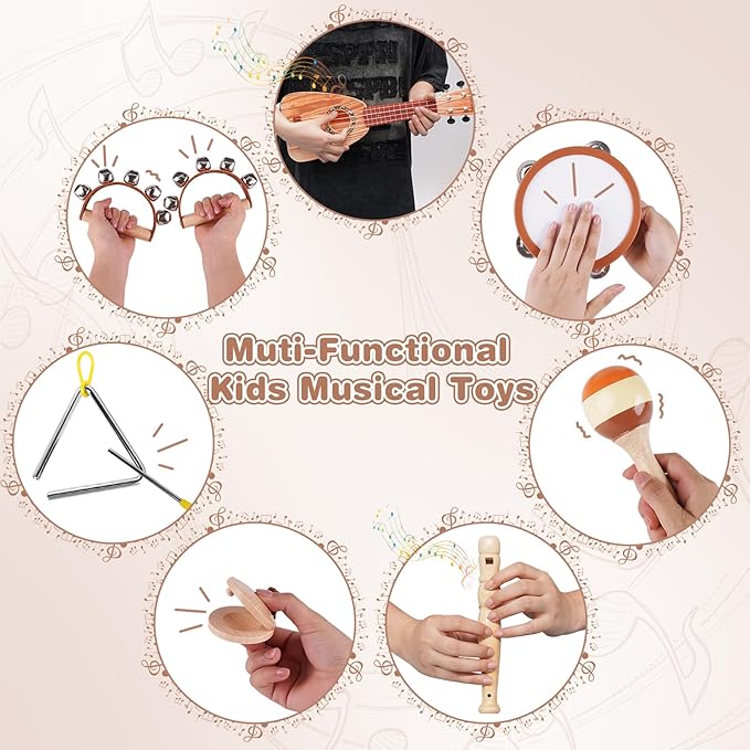 • Educational Montessori Toys: As an early development toy set, toddler can develop their sense of hearing and touch by playing with these musical instruments, which help to develop their sensitivity to music and sense of rhythm, and improve their creativity and ability to recognize musical instruments.