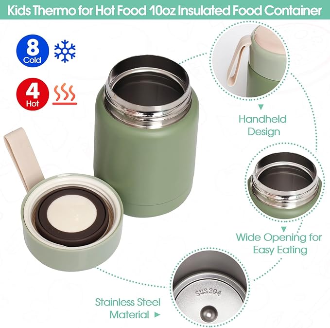 • The food thermos measures 3.3 x 5.1 inches and the insulated food jar has a 10 oz capacity, big enough to hold your delicious soup or beverage. The insulated food jar is made of food-grade 304 stainless steel, which has good heat insulation and cold preservation properties.