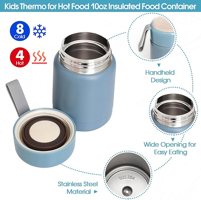 • The food thermos measures 3.3 x 5.1 inches and the insulated food jar has a 10 oz capacity, big enough to hold your delicious soup or beverage. The insulated food jar is made of food-grade 304 stainless steel, which has good heat insulation and cold preservation properties.