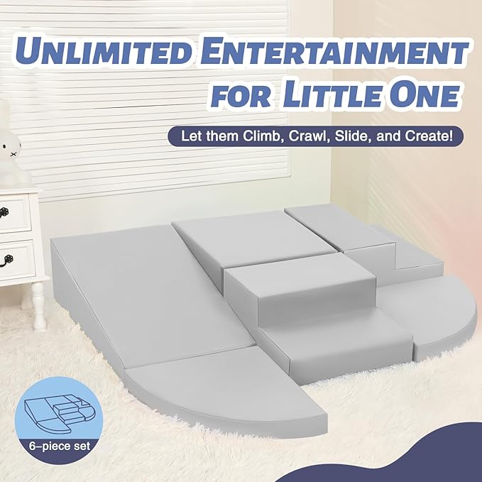 • 6-Piece Set: Baby climbing blocks consists of 2 grey stairs, 2 grey half-moons, 1 grey square and 1 grey slide. This soft play equipment stimulates your child's imagination to create endless combinations of structures, allowing them to enjoy the fun of the toy as they climb up and down, stacking and swapping four different shapes. Our climbing sets have a unique patented design that your child is sure to love
