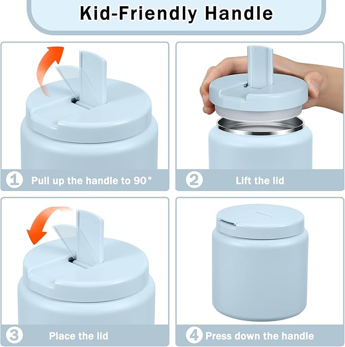 • Easy to Open: This thermos for hot food features a unique Buckle Structure design. Simply pull the handle to a 90Β° angle to easily open the lid. The handle is especially child-friendly, allowing little hands to open it with ease.