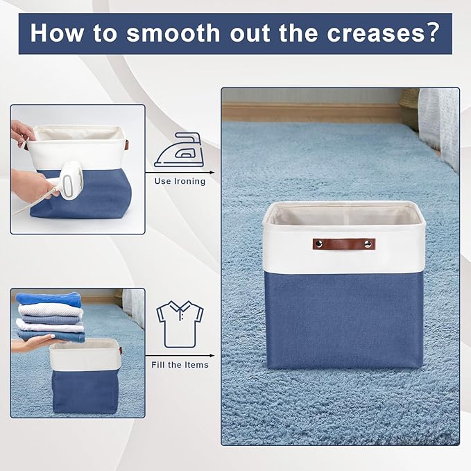 • 【Maintenance & Care Tip】 - Collapsible design for space saving. Our foldable baskets comes in a compression packing which may result in wrinkled storage bin during the long transit. Get rid of the wrinkles by either stuffing the fabric storage bins with blankets and pillows for a few days or steam iron them at low-heat setting. The organization baskets are easy to clean, you can dust the basket with a soft cloth with light soapy water when needed. Not recommended to machine wash.