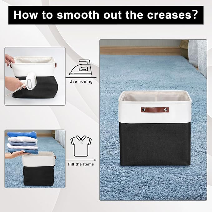 • 【Maintenance & Care Tip】 - Collapsible design for space saving. Our foldable baskets comes in a compression packing which may result in wrinkled storage bin during the long transit. Get rid of the wrinkles by either stuffing the fabric storage bins with blankets and pillows for a few days or steam iron them at low-heat setting. The organization baskets are easy to clean, you can dust the basket with a soft cloth with light soapy water when needed. Not recommended to machine wash.