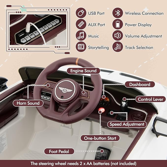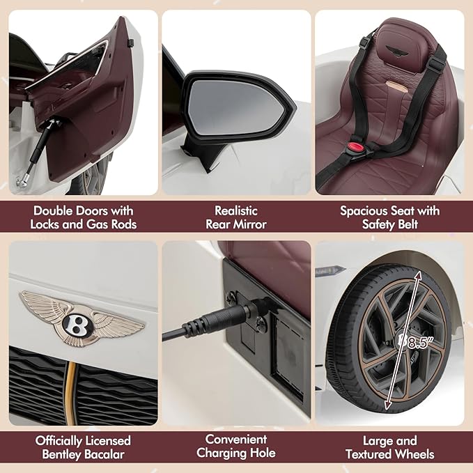 • 【Officially Licensed Bentley Bacalar】This licensed Bentley ride-on car features a super cool appearance that appeals to kids a lot. Double doors with locks and gas rods as well as realistic rear mirrors mimic the outlook of a real Bentley. Moreover, 2 × 12V powerful motors and a 12V rechargeable battery ensure profound performance.