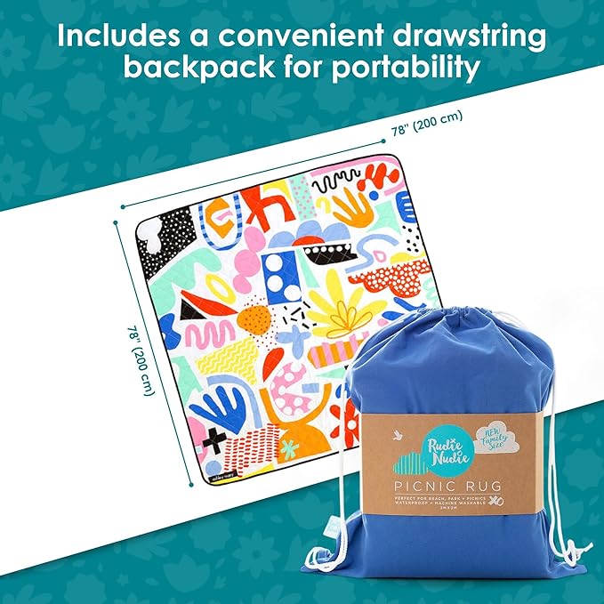 • Playful Pop Pip Pow design: The Pop Pip Pow picnic rug, combines playful patterns with vibrant colors that have made it a customer favorite. This fun and eye-catching design adds a lively touch to any indoor or outdoor setting.