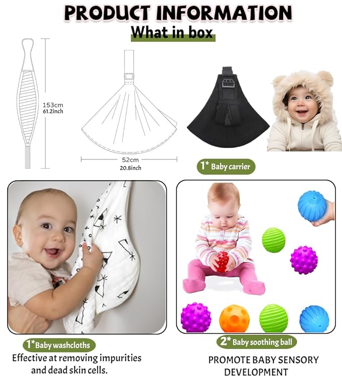 • 【What you get】 : 2 pcs different colors and shapes of toddler sensory ball, there are a variety of ways to play, colorful, more can attract the attention of the baby, 1pcs Baby Muslin Washcloths for Unisex 100% Cotton ,1pcs Convenient travel Baby Sling. is the holiday, Birthday, Thanksgiving and New Year's Christmas gift for your family and friends.