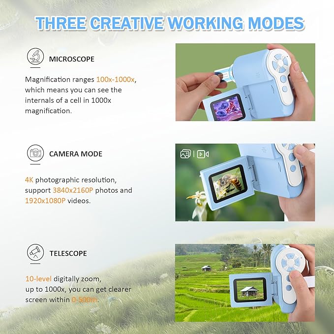 • ๐Ÿฏ-๐—œ๐—ป-๐Ÿญ ๐——๐—ฒ๐˜€๐—ถ๐—ด๐—ป: 1) Microscope Searching, 2) One-Click Photo & Video Recording, 3) Telescope, choose what you want to enhance child's learning experience. And this digital microscope made of 4K resolution, provides much higher clarity