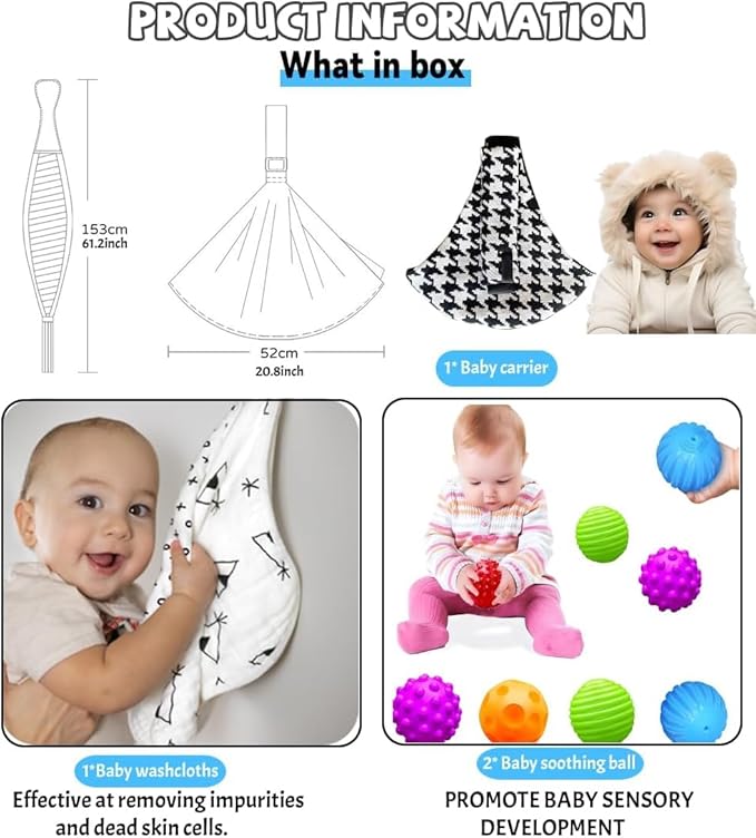 • 【What you get】 : 2 pcs different colors and shapes of toddler sensory ball, there are a variety of ways to play, colorful, more can attract the attention of the baby, 1pcs Baby Muslin Washcloths for Unisex 100% Cotton ,1pcs Convenient travel Baby Sling. is the holiday, Birthday, Thanksgiving and New Year's Christmas gift for your family and friends. Warning: This product is intended to be used with an adult for feeding and/or relaxation under direct adult supervision.