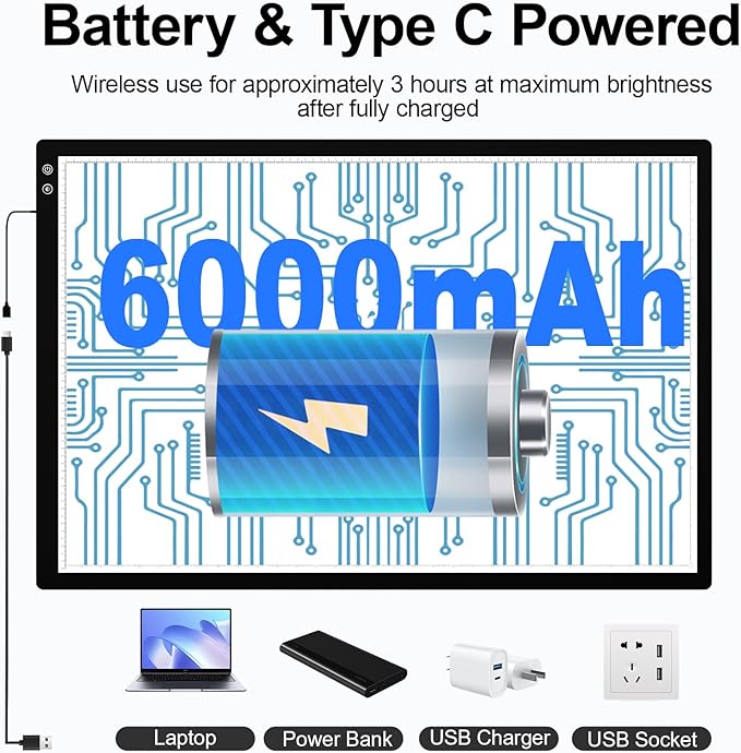 • 【 Built-in 6000mAh Battery 】 Our Upgraded Rechargeable A1 LED lightbox comes with a 6000mAh internal battery which allows you to use it any where without any power source, which makes your project more convenient as well as more enjoyable! Works for around 3 hours at MAX brightness after fully charged 3 hours at a time. This A1 lightpad uses a USB-C interface to easily access any USB port, such as a USB wall charger, computer, laptop or mobile power bank.