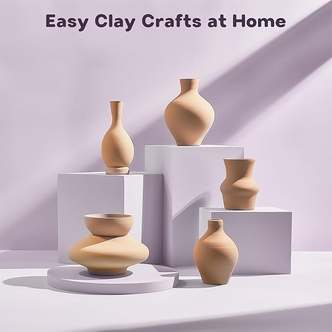 • Complete Pottery Kit: This kit includes a pottery wheel, power adapter, 8 sculpting tools, 2 paint brushes, 3 packs of air-dry clay, and 12 vibrant paints. Ideal for beginners starting their pottery adventure