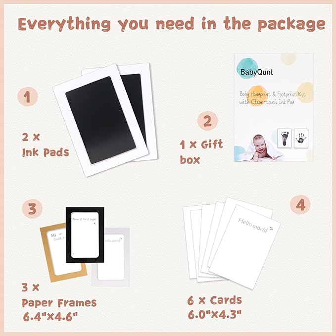 • 【Product Details】: Our baby hand and footprint kit measures 6.0"x4.2" with an ink window of 4.9"x3.1", which is the best size for recording hand and footprints of newborns 0-6 months old or pet paw prints . The ink pad for baby hand and footprints includes 2 clean touch ink pads, 6 stamping cards, and 3 display frames, ensuring you have ample opportunity to capture the best stamp.
