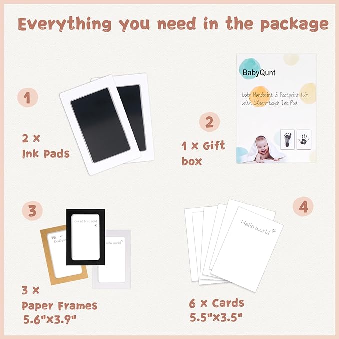 • 【Product Details】: Our baby hand and footprint kit measures 5.0"x3.2" with an ink window of 3.7"x2.3", which is the best size for recording hand and footprints of newborns 0-6 months old or pet paw prints . The ink pad for baby hand and footprints includes 2 clean touch ink pads, 6 stamping cards, and 3 display frames, ensuring you have ample opportunity to capture the best stamp.