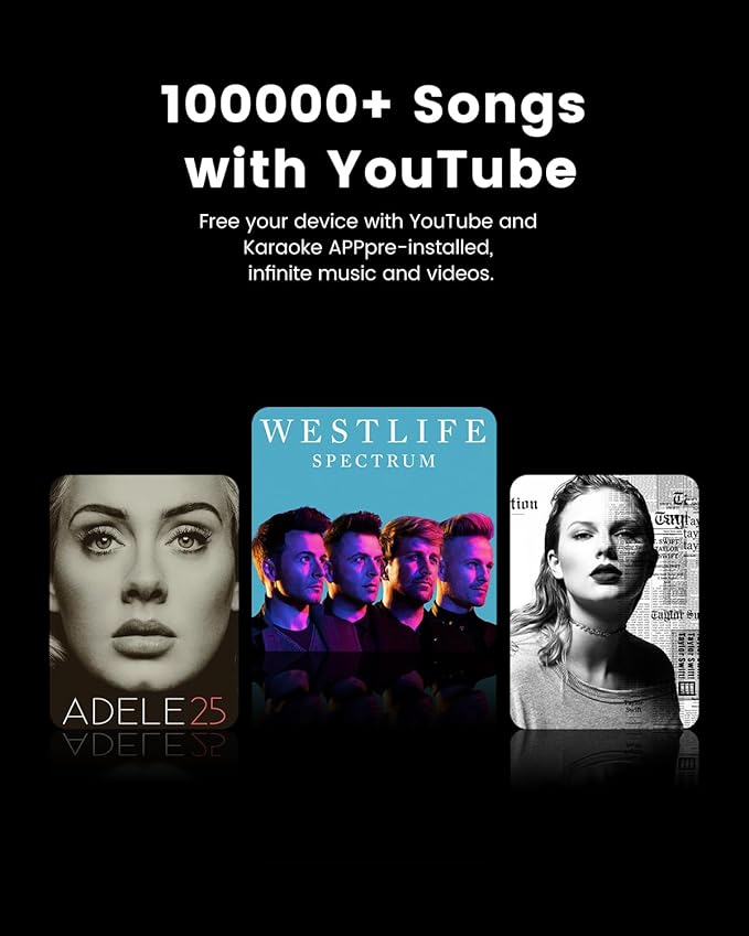 • Ultimate All-in-One Karaoke Experience: Designed for true karaoke enthusiasts, Ikaraoโ€™s karaoke machine features a built-in touchscreen and seamless Wi-Fi connectivity, enabling direct access to YouTube, KaraFun (Apps for Singing. Thousands of Karaoke Songs) and other streaming platforms. Dive into your favorite tracks without needing extra devices, making setup quick and convenient