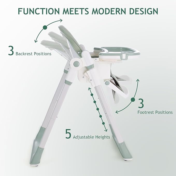 • Adjustable High Chair: The high chair offers a versatile and convenient solution for your growing child, it has 5 adjustable heights, 3 positions for the back rest and 3 options for the foot rest to ensure optimal comfort for your little one during mealtime