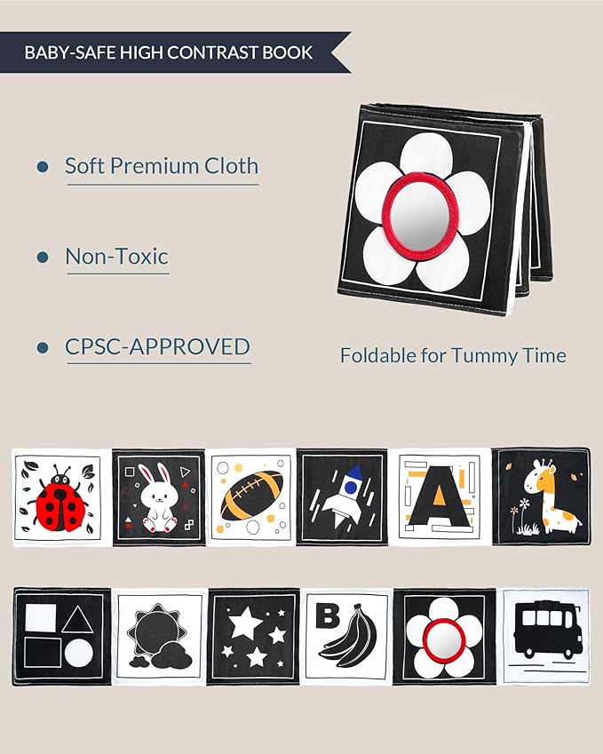 • Perfect Baby Gifts & Registry Must-Have: Whether you're looking for a baby shower gift, a baby birthday gift, or adding to a baby registry, this Black & White Baby Book Toy is a thoughtful and practical choice. It combines educational value with a design that parents and babies will love, making it a perfect addition to any baby registry search.
