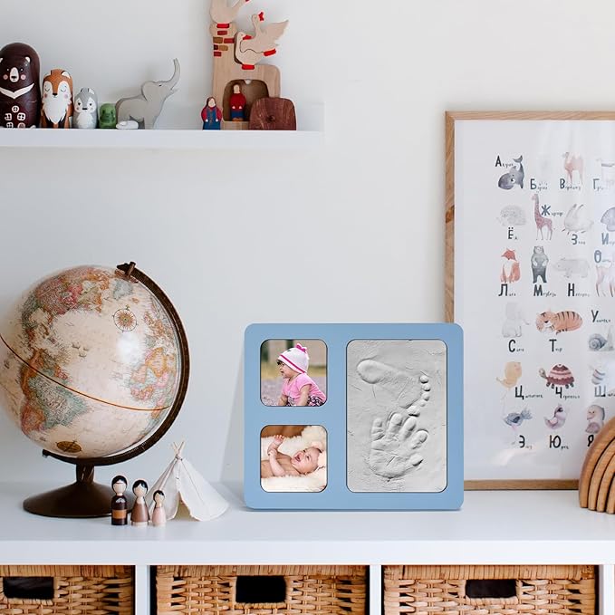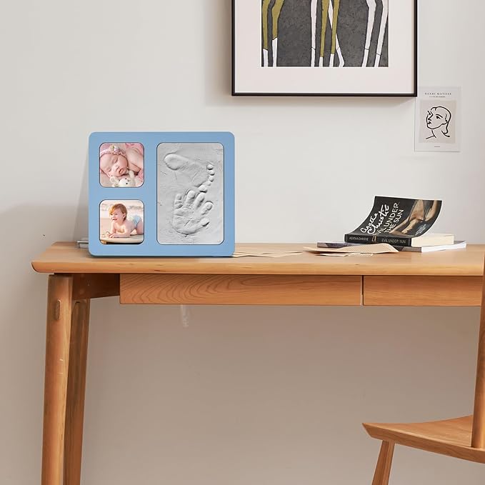 • Unique Design: The appearance of the baby hand and footprint kit frame adopts blue as the base color, and the frame has 4x6 inches of clay, which can hold 2 photos of 2.8x2.8 inches.