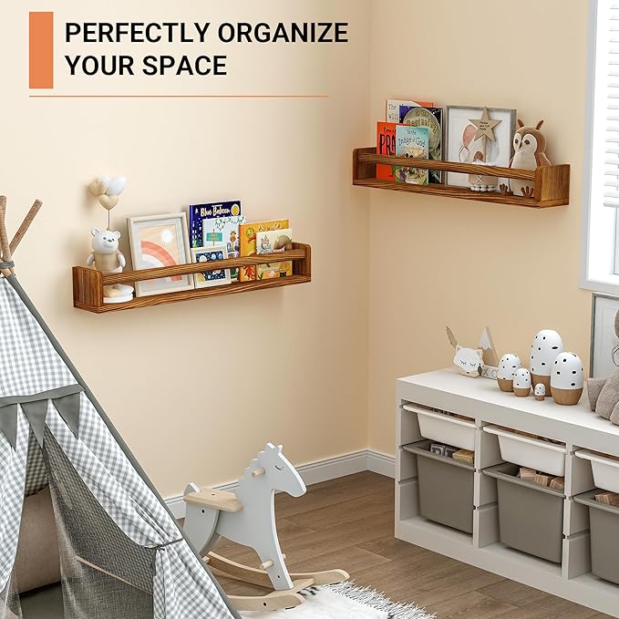 • [Ample Storage Space] - Measuring 24 inches, these nursery shelves offer ample room for organizing children's books, toys, photos, and other small items. They encourage a love for reading while keeping spaces tidy. With 0.6” thicken panels, each bookshelf can hold up to 30 LBS