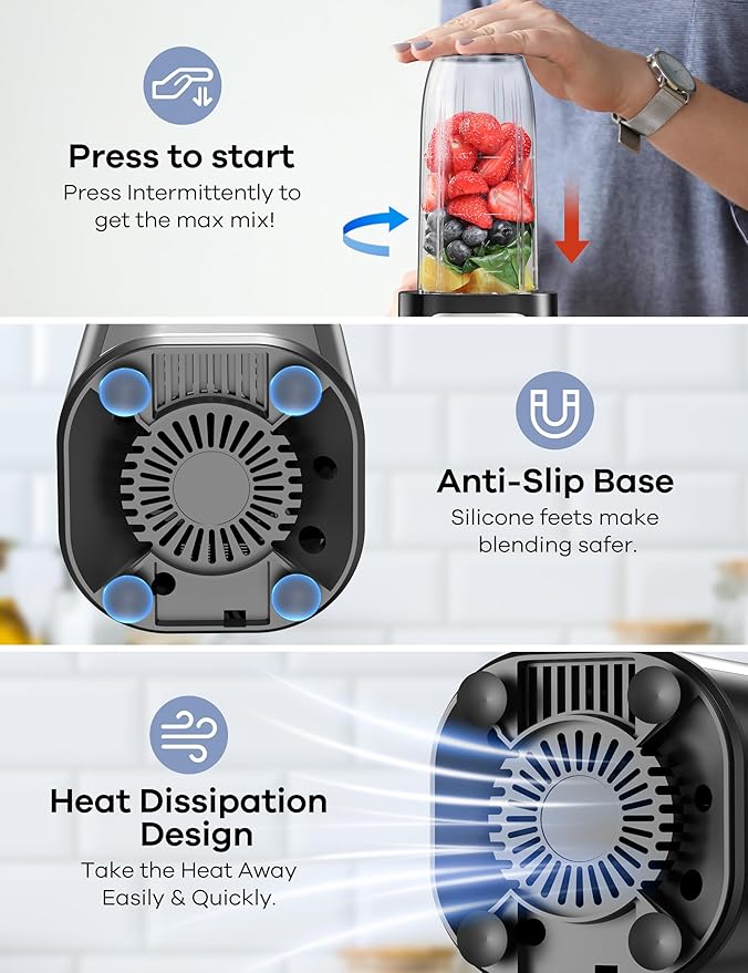 • EASY TO CLEAN: the electric smoothies blender only works when the mixing cup is properly pressed down; Cooling fan on the bottom and the back dissipates heat quickly; Four non-slip silicone pads keep the food blender balanced while working; Cups and lids are dishwasher-safe.