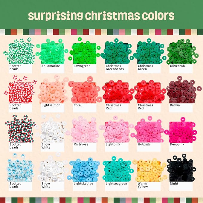 • BRACELET KIT INCLUDED - Flat clay beads in 24 selected colors, includes 4 handcrafted speckled beads, each is about 160pcs. 240pcs gold letter beads. Approx. 120pcs 4mm seed beads in christmas red, green and white. Red crystal diamond-like beads. Christmas-themed, fruits style, flower style polymer clay beads. Smile beads, pearl beads, colorful heart, starfish, and gold spacer beads. Christmas-themed pendants includes Santa, reindeer, xmas tree, stocking stuff, etc