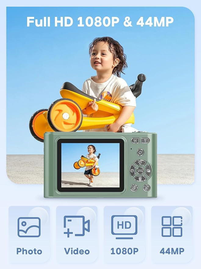 • 【1080P & 44MP Digital Camera】Capture stunning photos and videos with the Digital Camera. Equipped with a high-resolution CMOS sensor and an IPS color screen, this camera allows you to capture memories in vivid detail. With the capability to capture 44MP photos and record in smooth 1080p video, your photos and videos will come to life. Designed for kids, teens, and beginners, this point-and-shoot digital camera requires no intricate setup, making it easy to use and enjoy. It is the perfect tool for nurturing kids' interest in photography and creating delightful moments with family and friends.