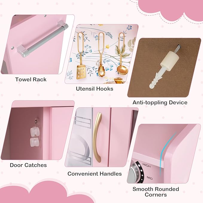 • 【ASTM & CPSIA Certified & Child Secure Design】Made of solid MDF material, this toy kitchen sets is stable and sturdy for long service life. What’s more, the equipped anti-toppling device attaches the kids play kitchen to the wall tightly, avoiding accidental falling.