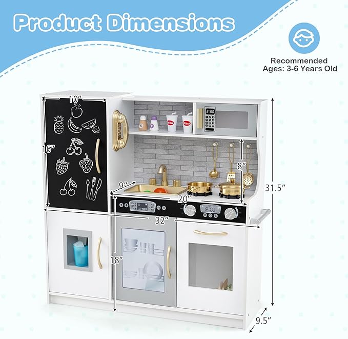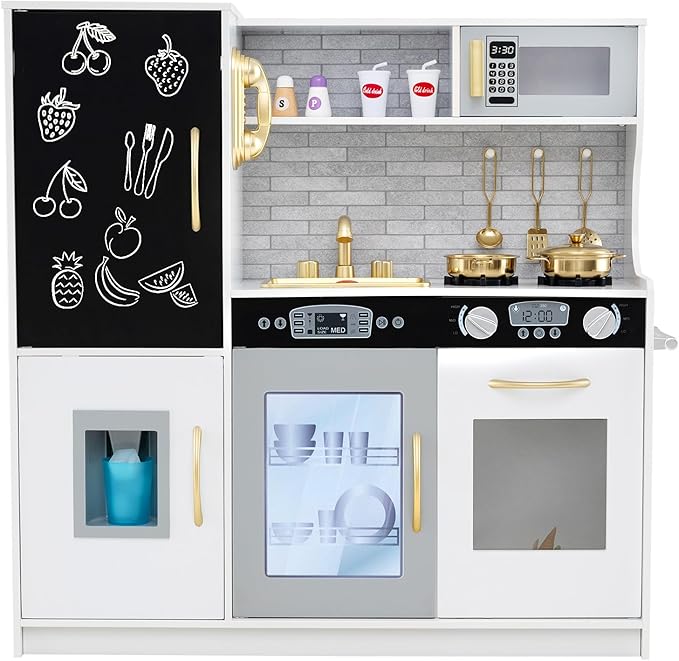• 【Fun Chalkboard Surface】 With a built-in blackboard, this HONEY JOY kids kitchen playset allows kids to write down the menu today! Stylish backsplash with realistic microwave, fridge, freezer, and dishwasher adds a modern appeal and create an immersive play experience for children and kids.