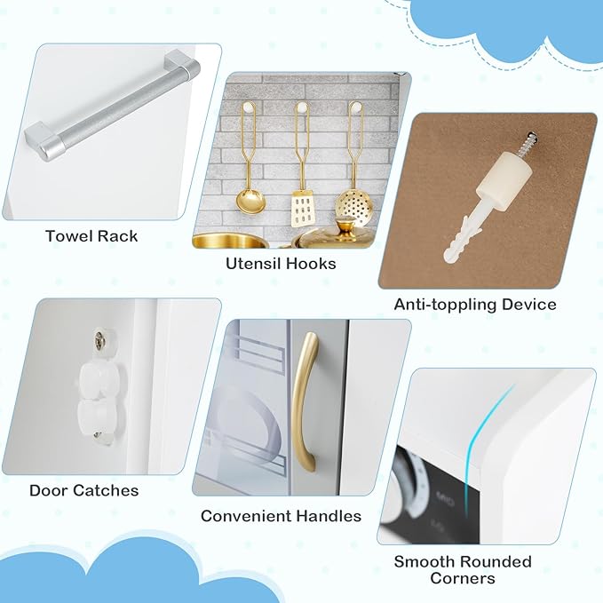 • 【ASTM & CPSIA Certified & Child Secure Design】Made of solid MDF material, this toy kitchen sets is stable and sturdy for long service life. What’s more, the equipped anti-toppling device attaches the kids play kitchen to the wall tightly, avoiding accidental falling.