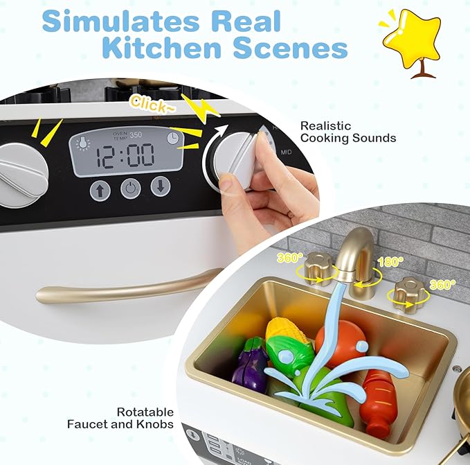 • 【Perfect Gift for Kids】Designed with a modern and stylish style, the pretend play kitchen is a great role play toy for children aged 3+ years old. The kid-friendly height makes kids enjoy hours of fun to develop hands-on ability, inspire creativity, improve social skills and enhance parent-child interaction.