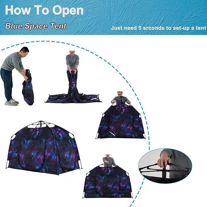 • Unique design-The unique wheel hub design makes it only take 3 seconds to open the tent and the setup can be completed with a simple pull. The beautiful three-color LED lighting adds more sensory elements to the tent. This kids tent has 3 zip doors and 2 zip windows. The windows are screened ,and it is very roomy which ensures the ventilation and fun