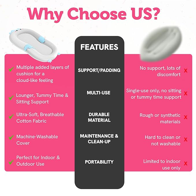 • Travel-light versatility – weighs under 2 lb, packs flat into a tote and features a non-slip base for couch, floor or patio use, giving baby a familiar lounging zone from nursery to grandparents’ house while you leave bulky gear behind.