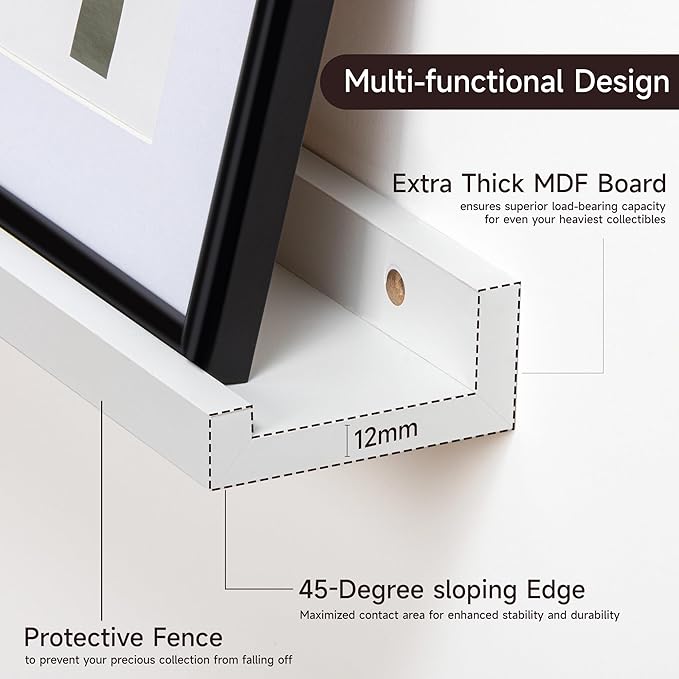 • 3.5" PICTURE LEDGE DESIGN: Ideal for displaying photos, artwork, or collectibles, these feature a thoughtful extremely narrow 3.5-inch width ledge design to prevent items from sliding forward, its mounting holes are spaced 16 inches apart for secure mounting to wall studs uncluttered aesthetic
