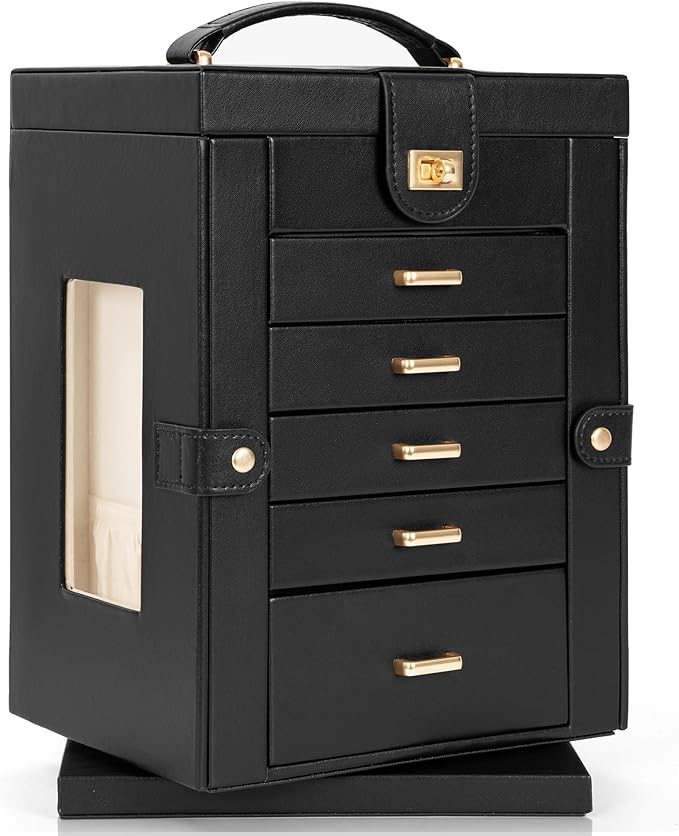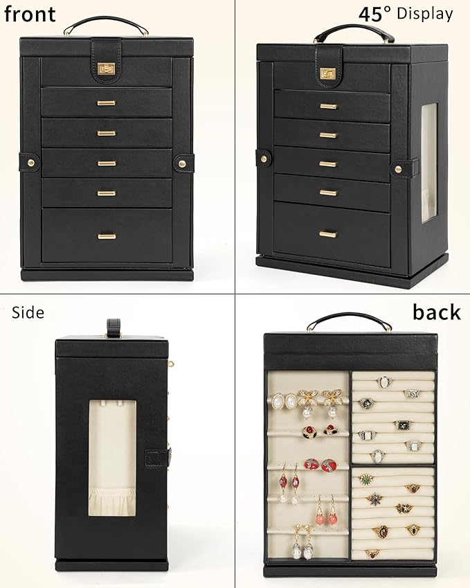 • 【Large Capacity,More Storage Space】With 6 versatile pull out drawers, and additional ring and earring storage at the back,this jewelry box can store a lot of jewelry accessories, such as rings, earrings, necklaces, chains, bracelets and so on. One deeper drawer is designed for watches,sunglasses or large jewelries.Material: Faux Leather,MDF (Medium Density Fiberboard),Velvet,Acrylic
