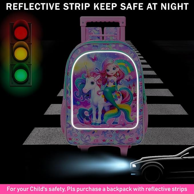 • Eye-Catching Design: This girl rolling backpack is made of new uv printing technology, interesting and fun, the cute mermaid shines. The high quality eco-friendly water-resistant fabric makes kids wheeled backpack perform better.
