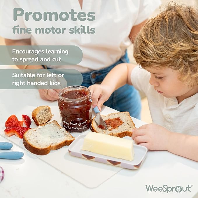 • COMPLETE SET: Includes 2 perfectly sized knives, 2 forks, and 2 spoons, with each set featuring two unique colors. This complete set allows children to practice all aspects of dining. The appropriately sized forks and spoons bridge the gap between toddler and adult utensils, while the knives are ideal for spreading and learning basic cutting skills, helping children develop confidence with all utensils during mealtimes.