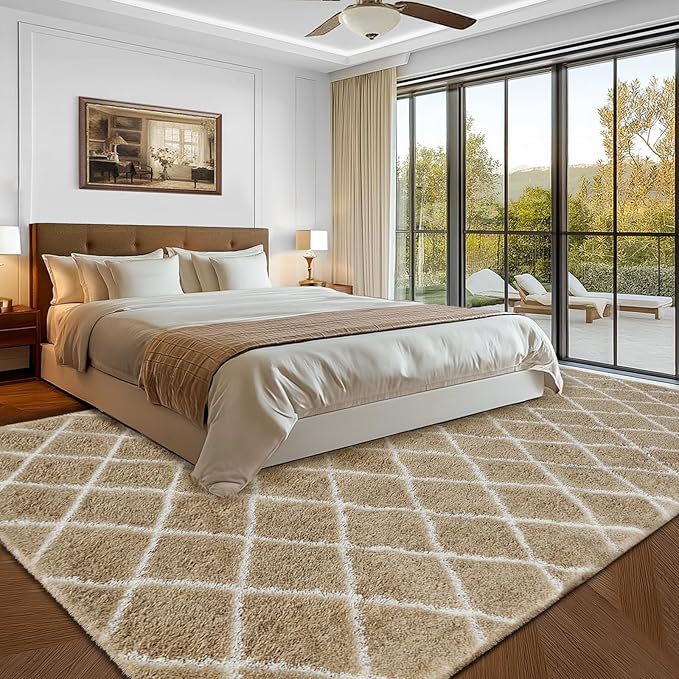 Fluffy Rug for Bedroom, 8X10Feet Stripe Checkered Rug Anti-Skid High Pile for Living Room Bedroom Kids Room Nursery, Dorm Home Decor