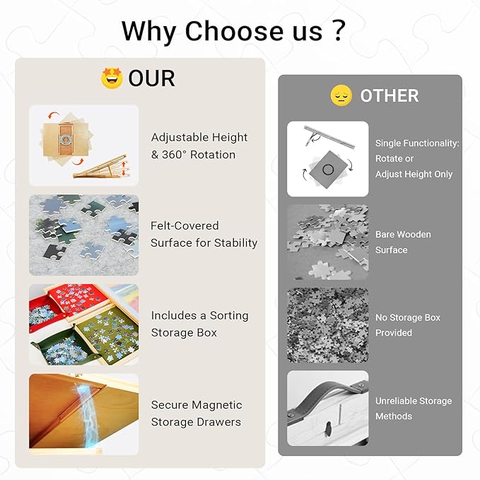 • 🧺 Smooth-Glide Drawers & Bonus Storage: Comes with 4 easy-slide drawers,4 puzzle partition trays, a pet-safe PP shield, puzzle saver stickers, and a built-in handle for easy transport and storage.